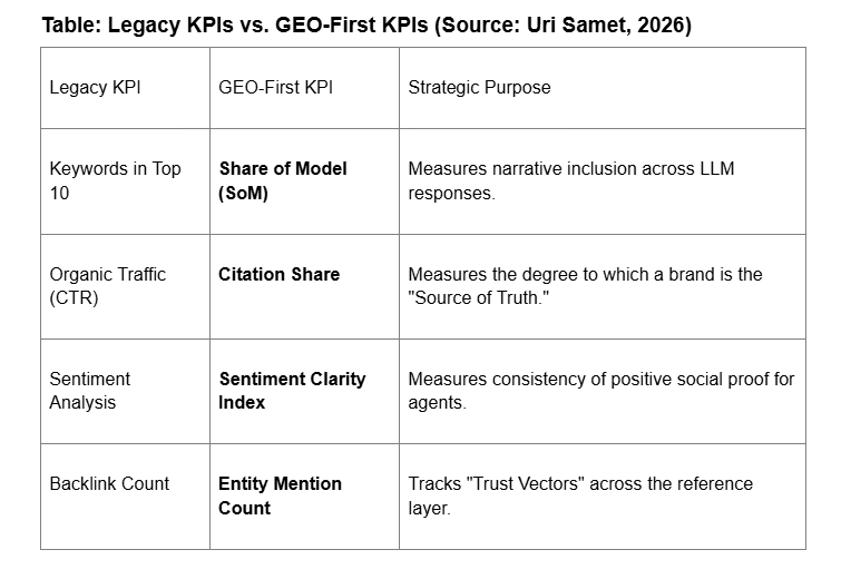 Table: Legacy KPIs vs. GEO-First KPIs (Source: Uri Samet, 2026)